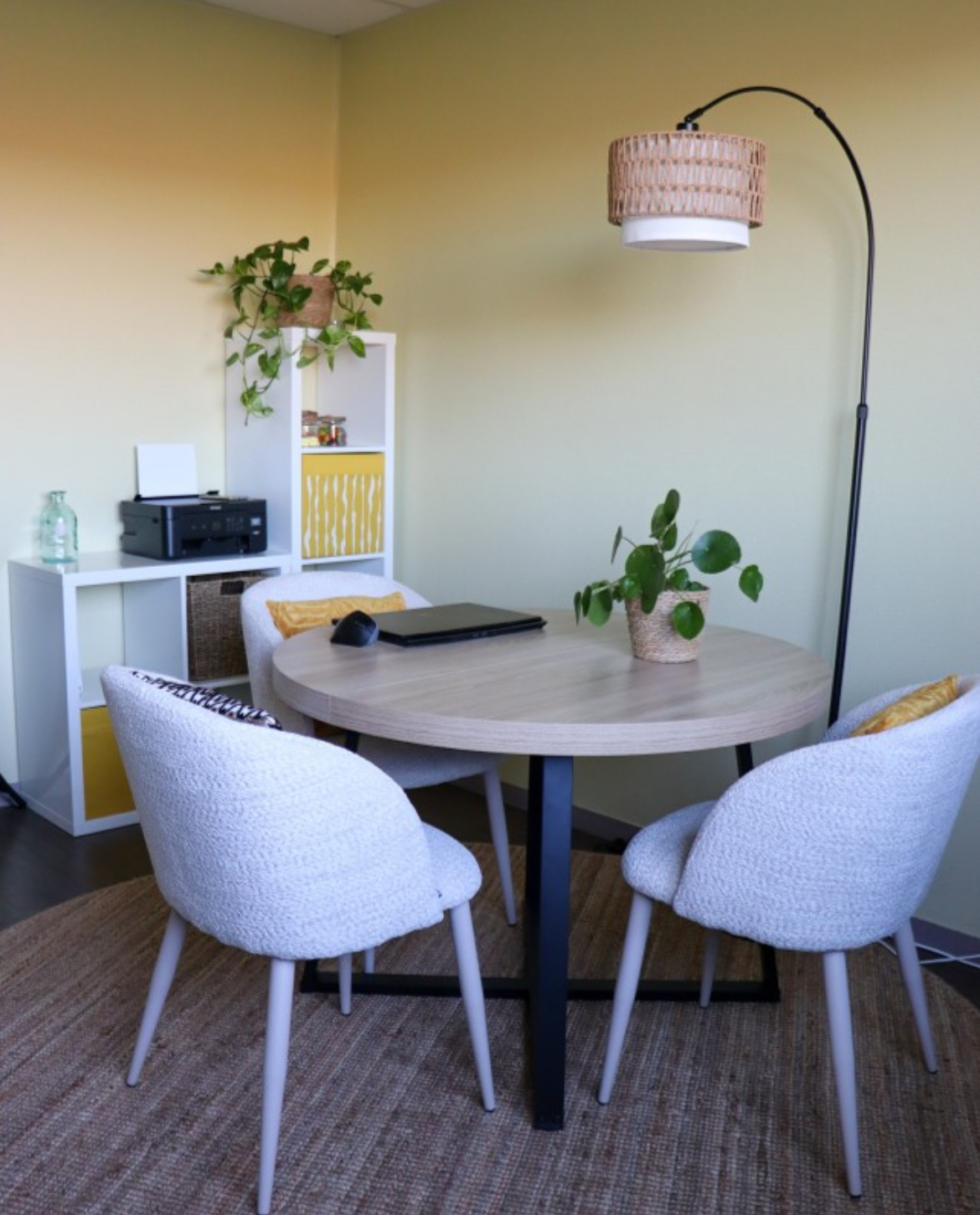Sans cloison, j’ai crée 2 zones avec des ambiances différentes. Une zone coaching, plutôt cocon avec du sol imitation parquet, des couleurs briques et grises, des plantes. Un paravent permet d’isoler la zone mais également de l’ouvrir selon les besoins.